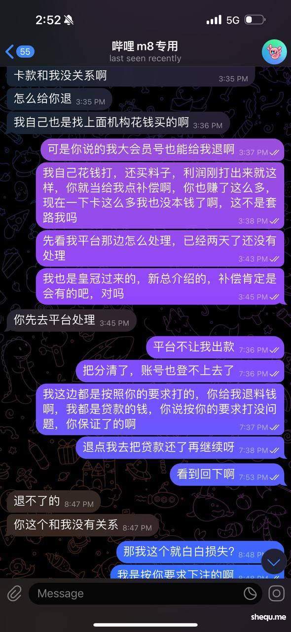 贷款20万,被朋友坑,被平台卡款,本人一直喜欢赌球和百家乐,平时买得也比较大,最近一年多在皇冠信誉盘和现金网输了大概150万,上个月在朋友的介绍下接触了电竞游戏方面的协议假赛,当时我也知道天下没有掉馅饼的事,耐不住看着朋友一直赚钱我就联系了我朋友,然后就给我推荐了一家在✈️上面做的很大的机构,该机构在搜索群排名第一,观察了很多天却是做的很大,一直没有尝试,后来朋友分我协议赛的额度我玩了几天发现能赚钱,我就开始联系做协议群的老板,此刻的坑人套路就开始了,老板叫我在现金网用级别高的会员号去打协议,利润要分他同时还要支付宝比赛的料钱,如果飞盘和卡款是会给我退料钱的。本人在开云一个月5000多万的流水,VIP等级9,因为电竞我没有接触过,刚开始打的时候,很多比赛下注都有限红,下注很少。前面导致我比赛中了加分他料钱一直都是亏本。陆陆续续下了2场大比赛之后就有盈利了,最后两场料子打完,问题就来了,我充值了8万元,赢了1场之后,就被平台卡款了,找了各种客服处理,说我账号有刷水套利的风险,把我账号给禁封了,加上给他的料钱和分的利润和平台的卡款,一共损失14万多,平台和料方都处理无果,甚至不回消息。回想一下,这其实就是一个难以发现的套路,假赛哪里都有,可是我们这种底成的人能赚钱吗?平台敢开这个盘,它不知道是否有假赛吗?其实就是盘的推手,你就算赢也赢不了多少,它们收取费用。是用自己的钱帮盘打工,等你真的赢钱的时候,5次6次或者很多次的时候平台会联合这个的庄一起连本带利的把吃掉。永远不要用现金网赌,赌的尽头就是被坑!